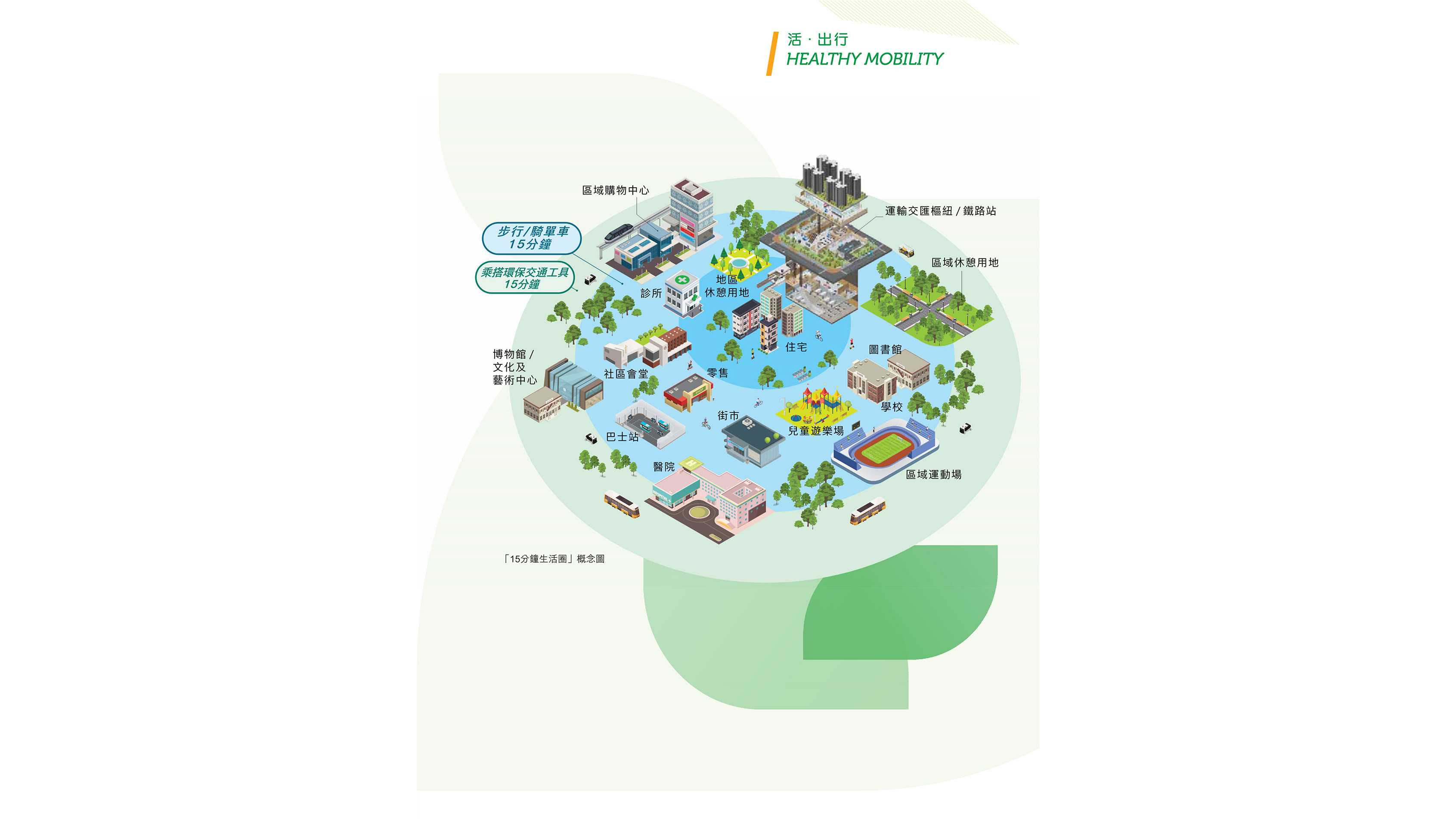 運輸及物流局公布《運輸策略藍圖》,在綠色規劃方面,當局會爭取今年向立法會提交修訂條例草案,訂定規管安排以容許在指定範圍安全使用電動可移動工具。新發展區會逐步落實「15分鐘生活圈」,讓居民可以透過主動出行模式,在15分鐘內輕鬆到達社區中的不同地點。