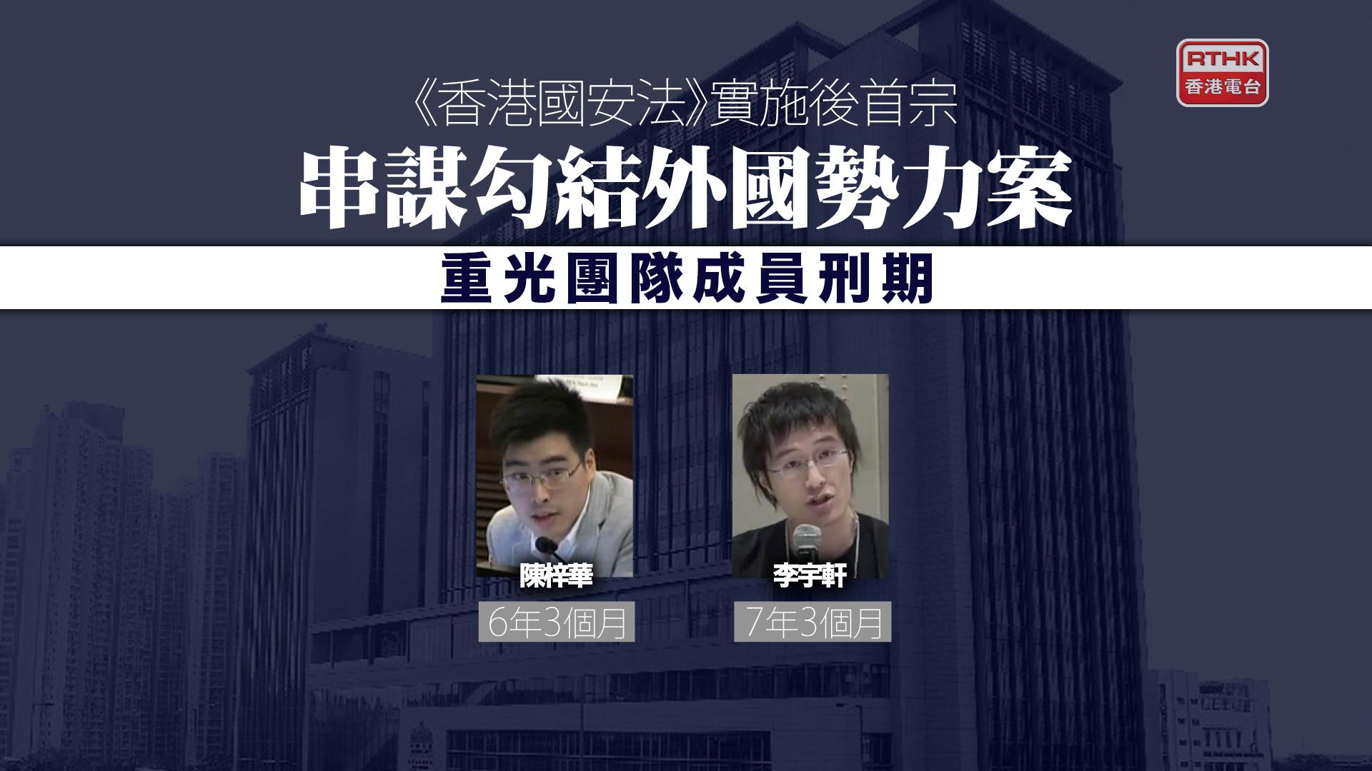 壹傳媒創辦人黎智英串謀勾結外國勢力案,以從犯證人身份出庭作供的兩名被告、重光團隊成員陳梓華及李宇軒,分別判監6年3個月及7年3個月。兩人早前承認一項串謀勾結外國勢力罪。