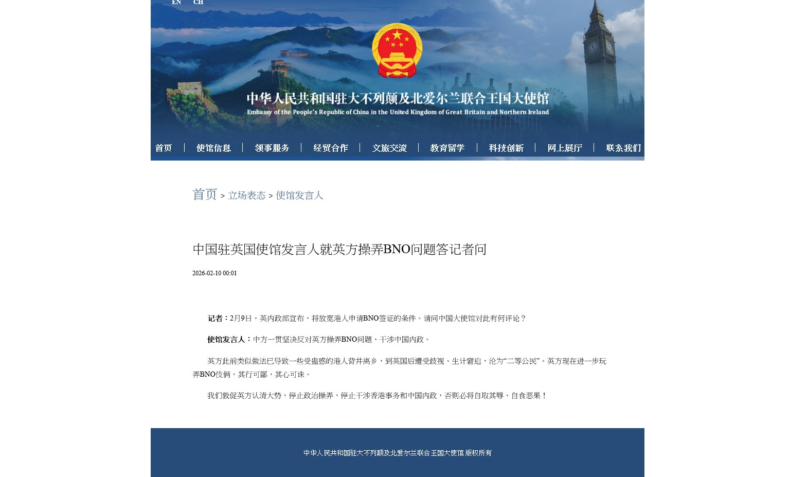 中國駐英國使館發言人:中方一貫堅決反對英方操弄BNO問題