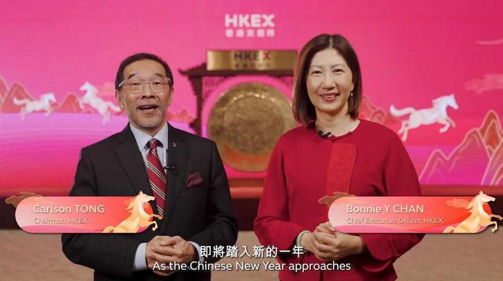 港股下星期一(年廿九)半日市。港交所在網站發布賀年視頻。唐家成及陳翊庭預祝市場馬年吉祥如意、龍馬精神。