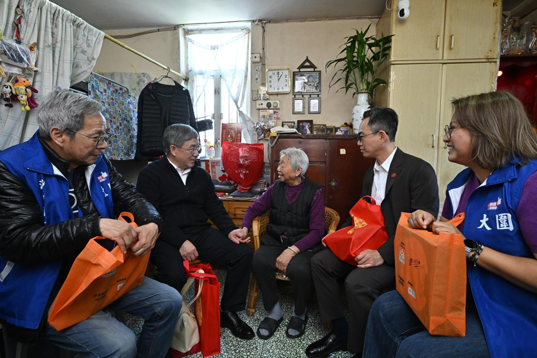 卓永興先後到大圍美林邨探訪一家三口、一名獨居長者、以及一名年過90歲的婆婆,向他們送上沙田民政事務處準備的福袋,包括有即燉湯包、鮑魚麵、冬菇、米及蛋卷,關愛隊就送上曲奇餅。卓永興亦送上年糕、蘿蔔糕等傳統賀年食品。