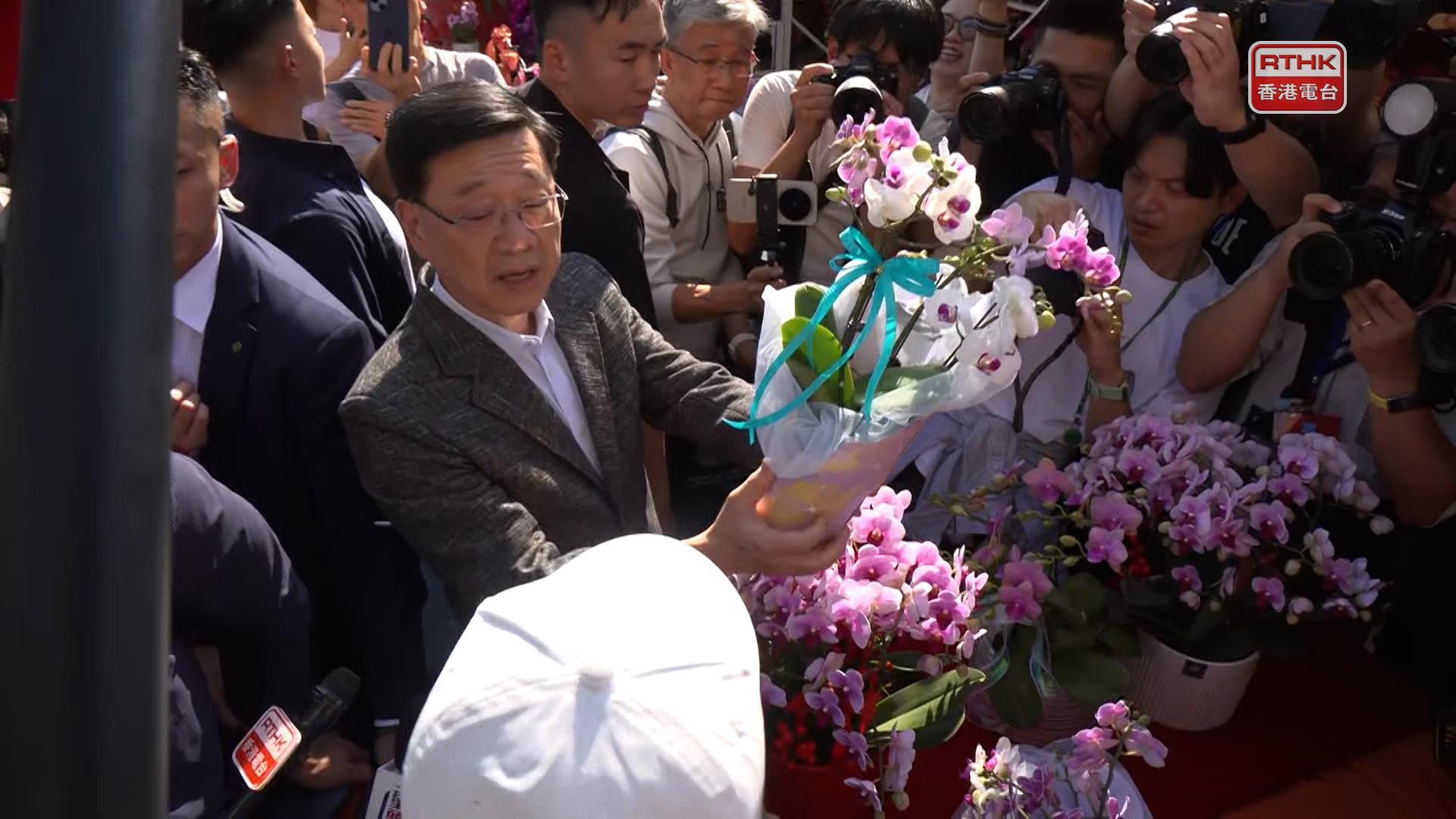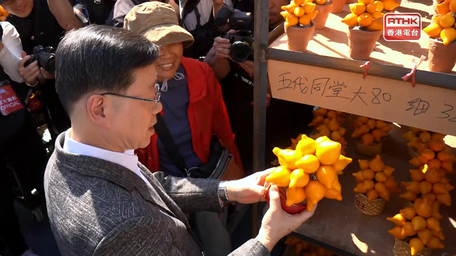 行政長官李家超到觀塘遊樂場年宵市場逛花市,期間在多個花檔停留並與負責人交流。