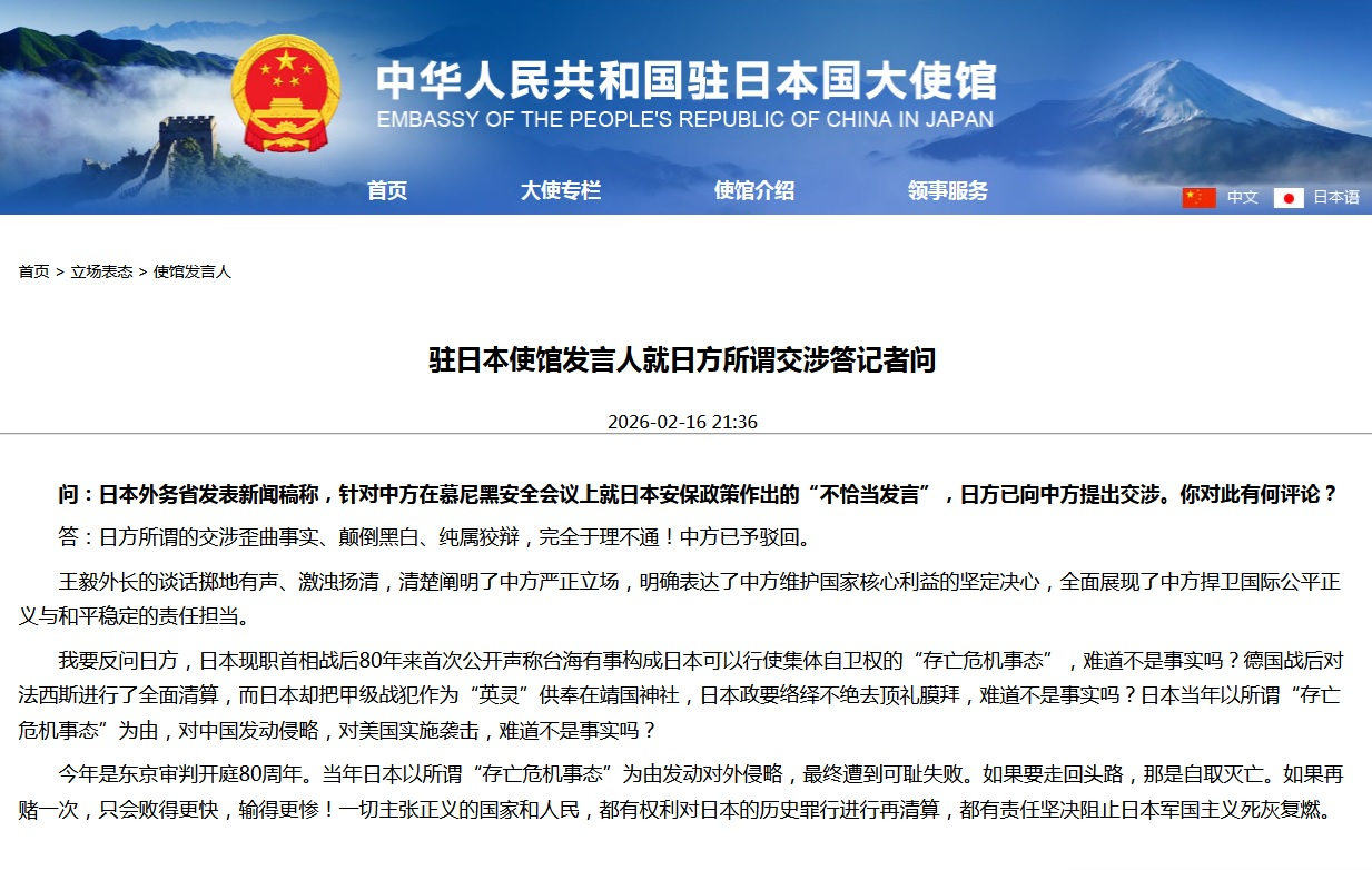 日本指控中方在慕尼黑安全會議上,就日本安保政策作出不恰當發言,向中方提出交涉。中國駐日本大使館回應說,日方所謂的交涉歪曲事實、顛倒黑白、純屬狡辯,完全於理不通,中方予以駁回。