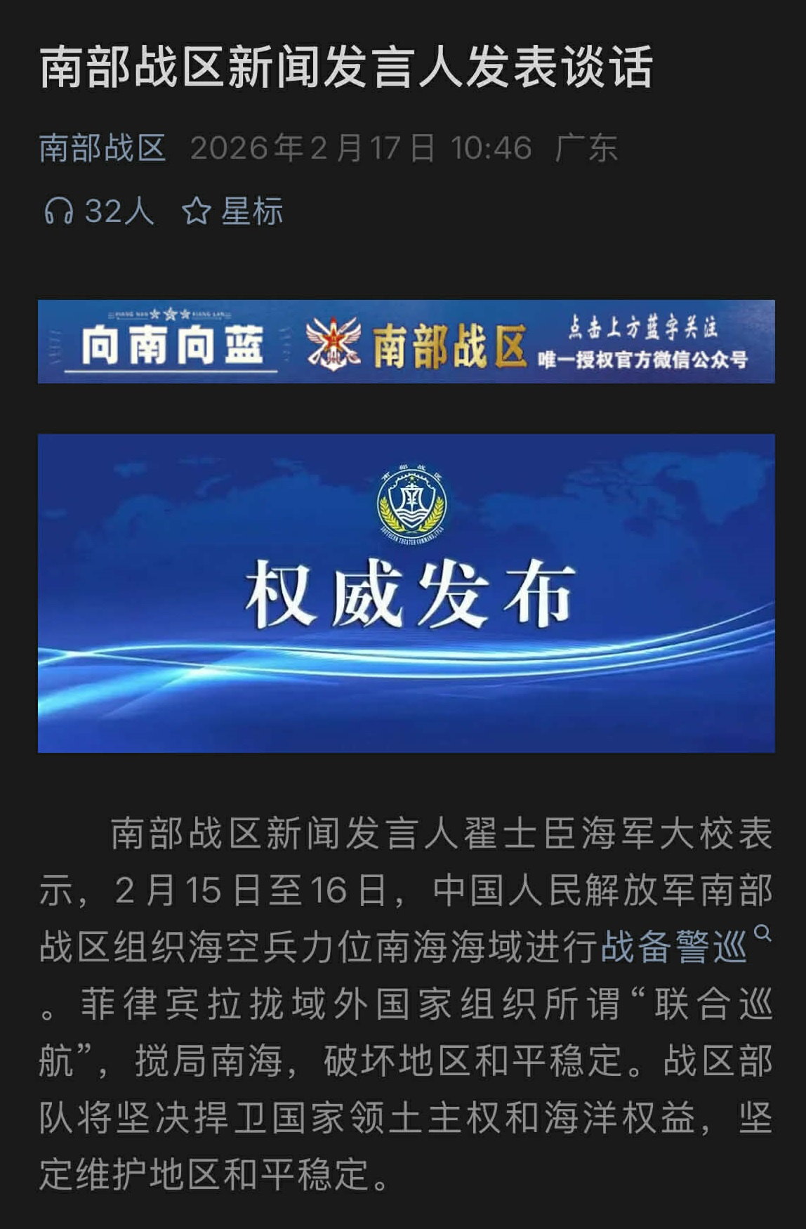 解放軍南部戰區新聞發言人表示,前日至昨日,南部戰區組織海空兵力在南海海域進行戰備警巡,指菲律賓拉攏域外國家組織所謂「聯合巡航」,攪局南海,破壞地區和平穩定。