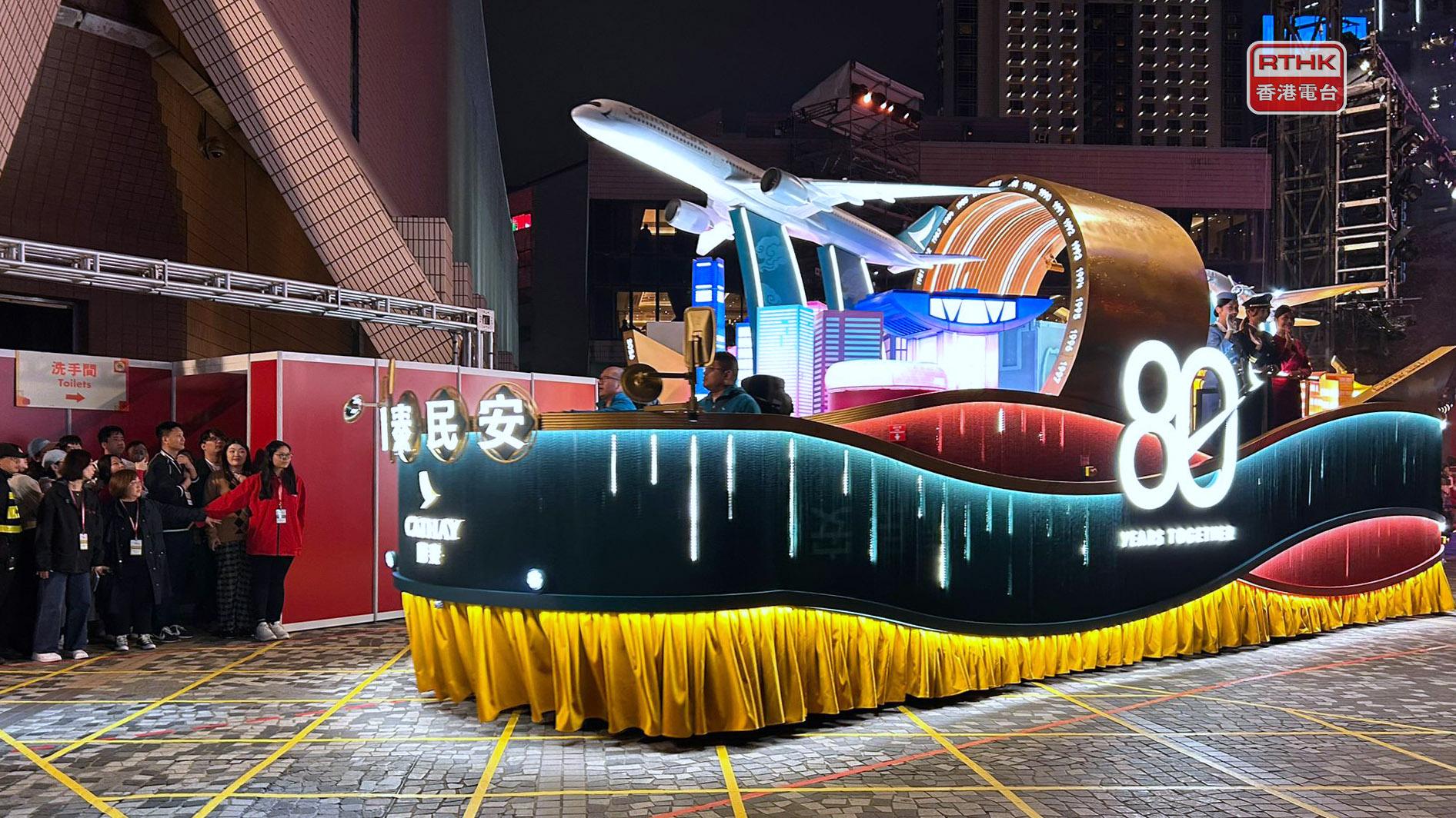 花車巡遊路線吸引大批市民和遊客觀看。打頭陣的花車是贊助機構國泰航空的花車,展示出兩款經典客機。之後登場的是賽馬會的花車,三匹「金馬」寓意馬年好運。海洋公園花車上,大熊貓家族就換上新春造型亮相。旅發局派出兩架花車,主花車是以中式帆船為設計藍本,副花車就是啟德體育園主場館造型的迷你花車。