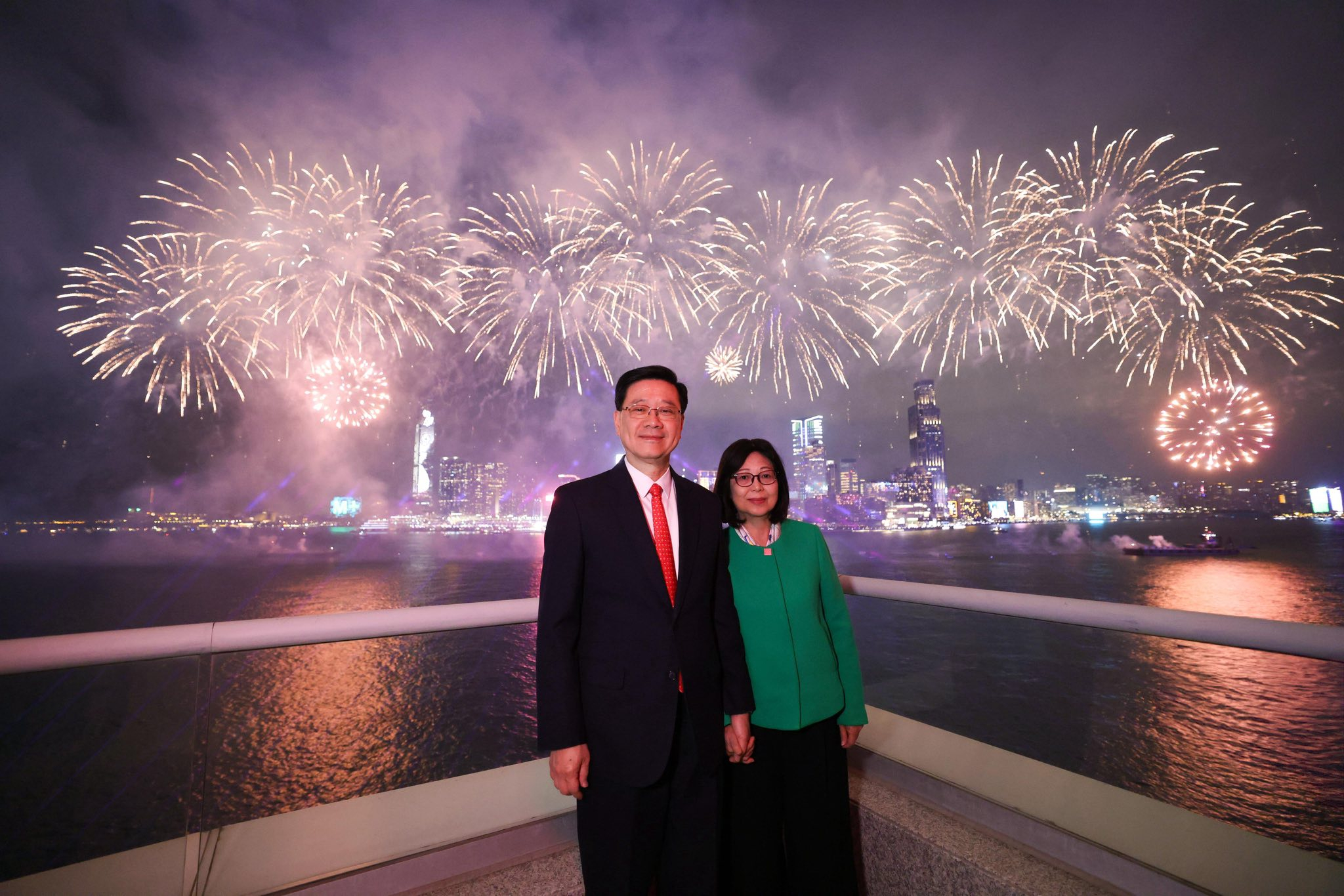 李家超與夫人到灣仔會展觀賞煙花,稱八幕匯演呈現萬馬奔騰的磅礡氣勢。(李家超社交網站圖片)