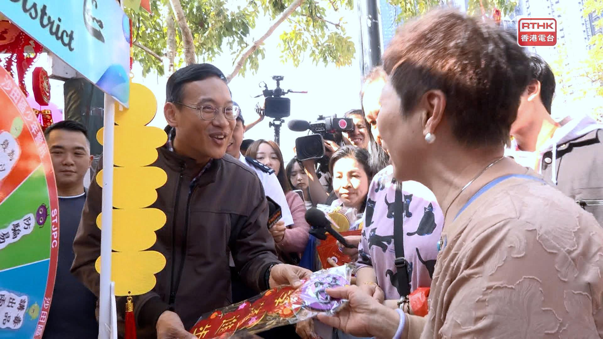 陳俊燊又到警務處沙田警區在車公廟外擺設的宣傳攤檔,與市民交流並向他們派發賀年揮春。