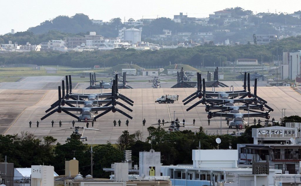 日本全國約七成的駐日美軍設施集中在沖繩縣,圖為位於沖繩縣宜野灣市的美軍普天間基地。(法新社資料圖片)