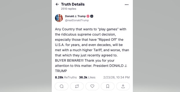 特朗普在旗下社交平台發出多條帖文,警告各國別「玩把戲」,指儘管聯邦最高法院裁定他引用《國際緊急經濟權力法》徵收的關稅無效,但法院的裁決確認他有權動用其他法律,以更有力、更具威懾性的方式合法徵收關稅。