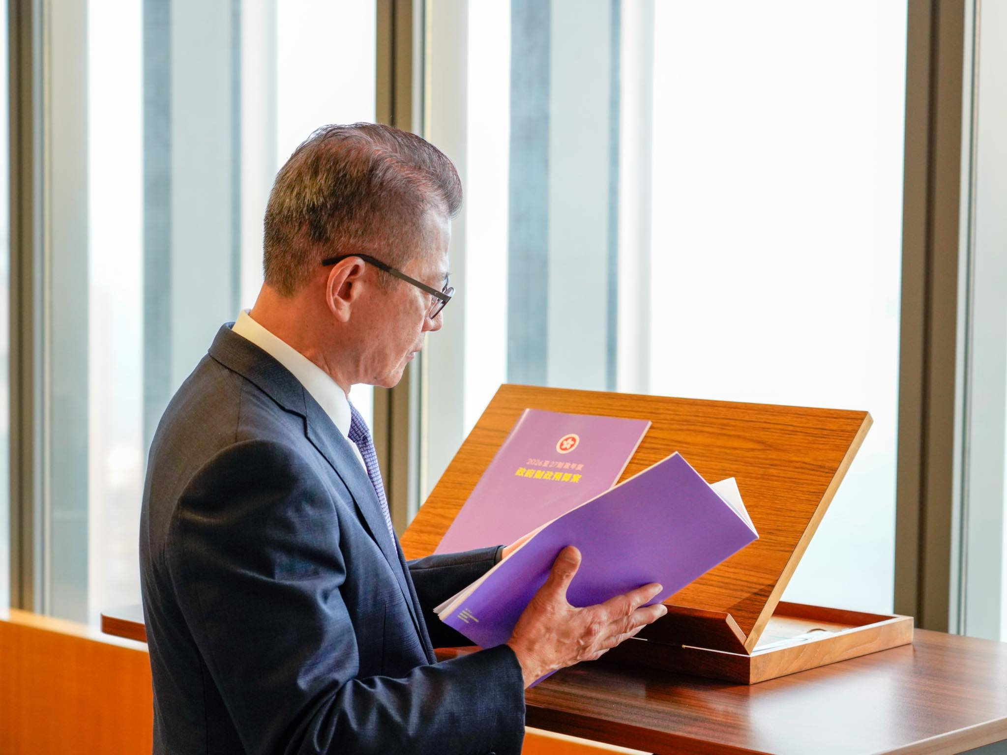 新一份《財政預算案》採用紫色封面,財政司司長陳茂波...