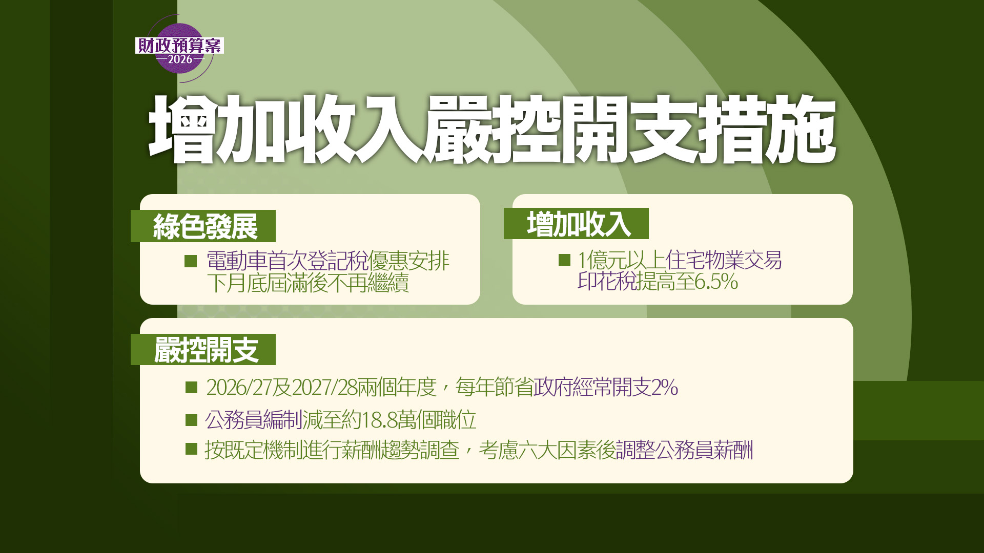 - 2026/27及2027/28兩個年度,每年節省政府經常開支2%