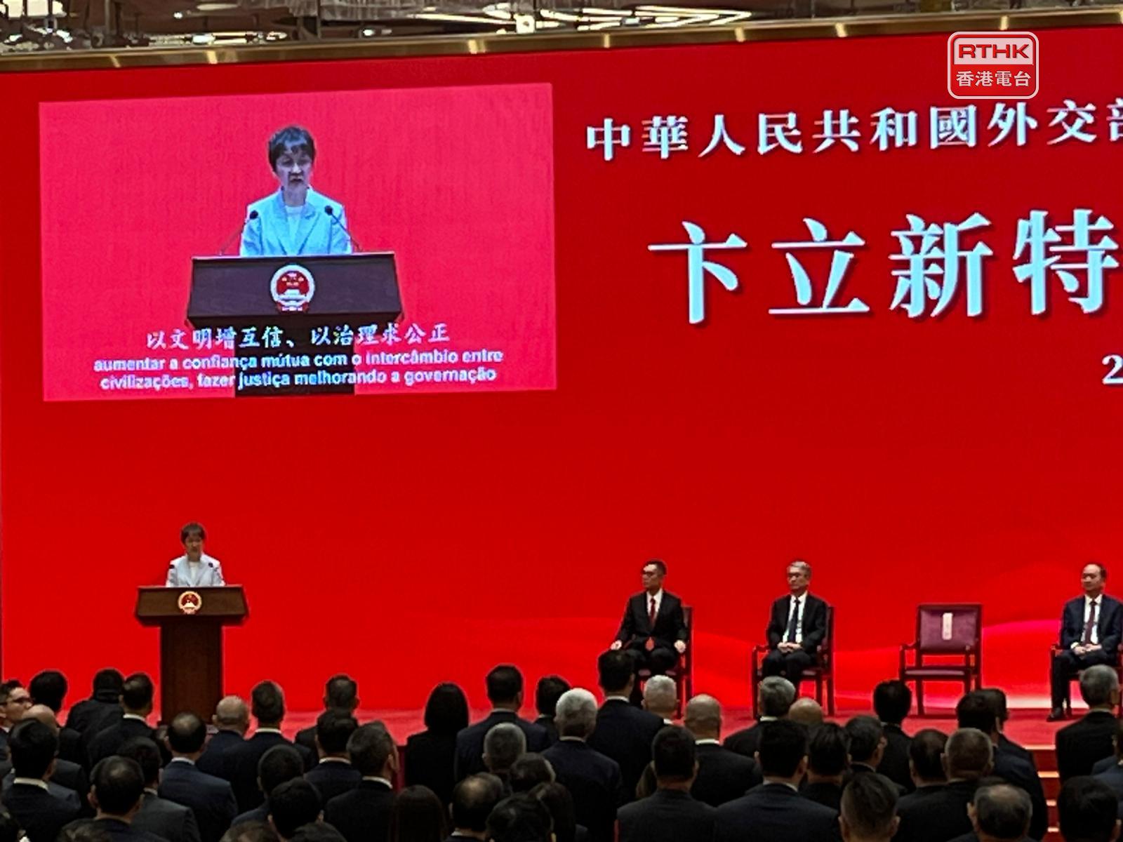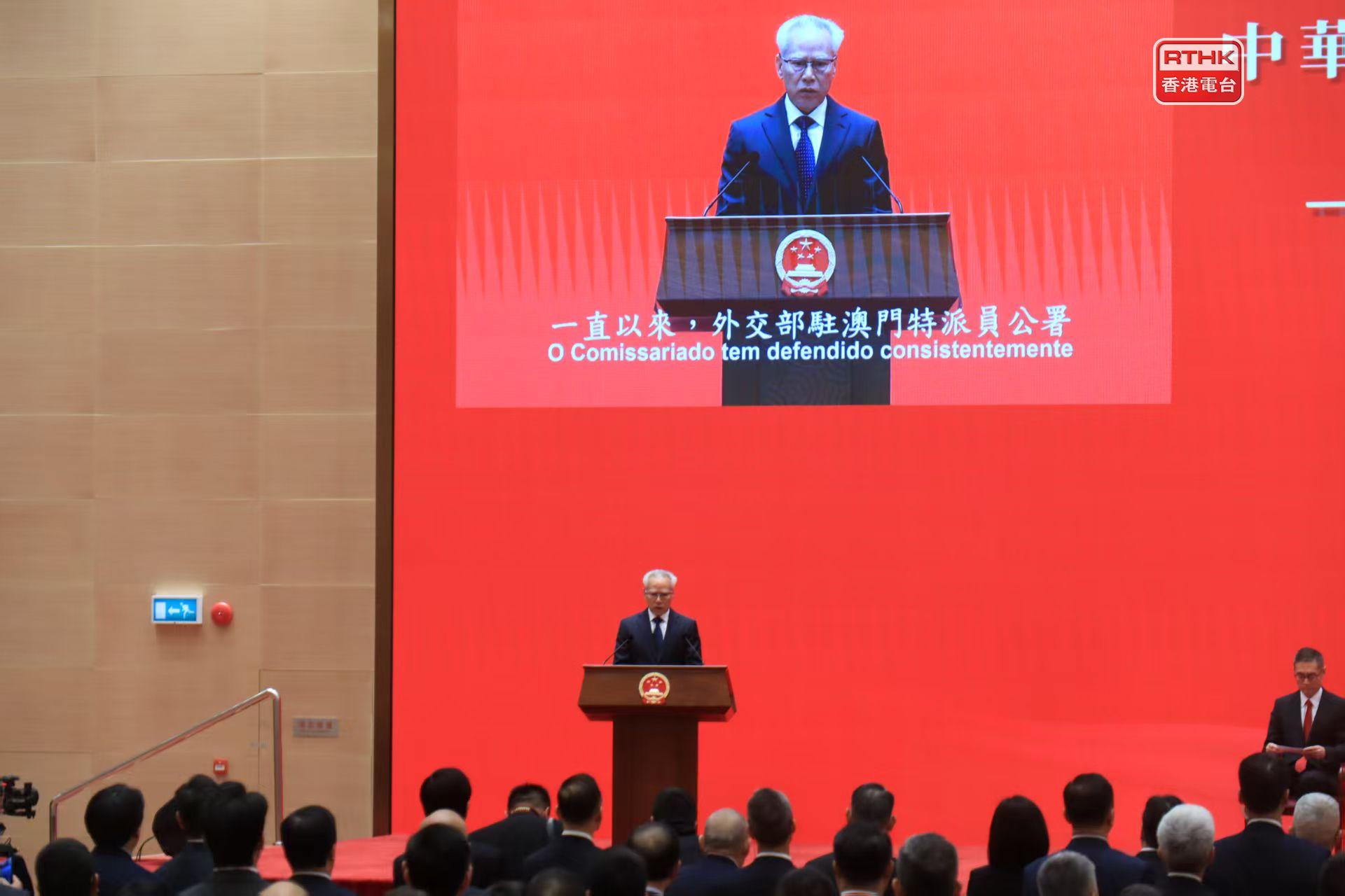 行政長官岑浩輝致辭時說,特區政府將繼續加強與特派員公署的溝通對接,並期望公署一如既往指導、支持和協助特區開展各項工作,共同將澳門打造成為國家高水平對外開放重要的橋頭堡、中西文明交流互鑒的重要窗口,提升澳門的國際競爭力和影響力。