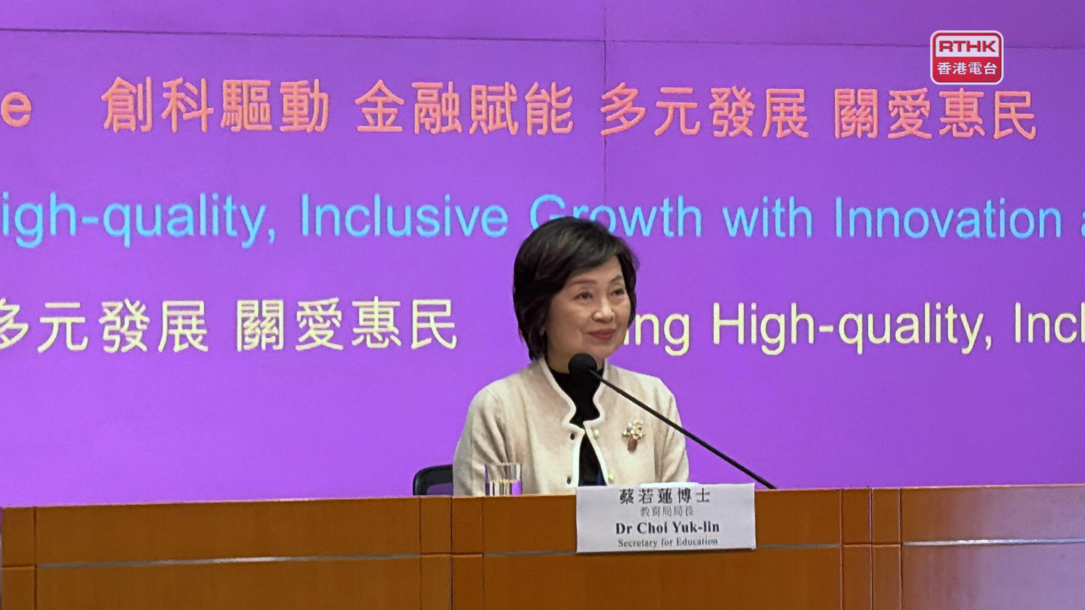 教育局局長蔡若蓮出席財政預算案相關措施記者會。對於下年度的教育總開支佔政府整體開支13.3%,比例至少是近20年新低。她回應說投放在教育的實際金額一直有增加,又說香港人口結構有明顯變化,學齡人口結構性下降,相較其他開支急速增長的範疇,例如應對人口老化的醫療等開支,看似投放在教育的資源比例有減少,但實際資源並沒有減少。