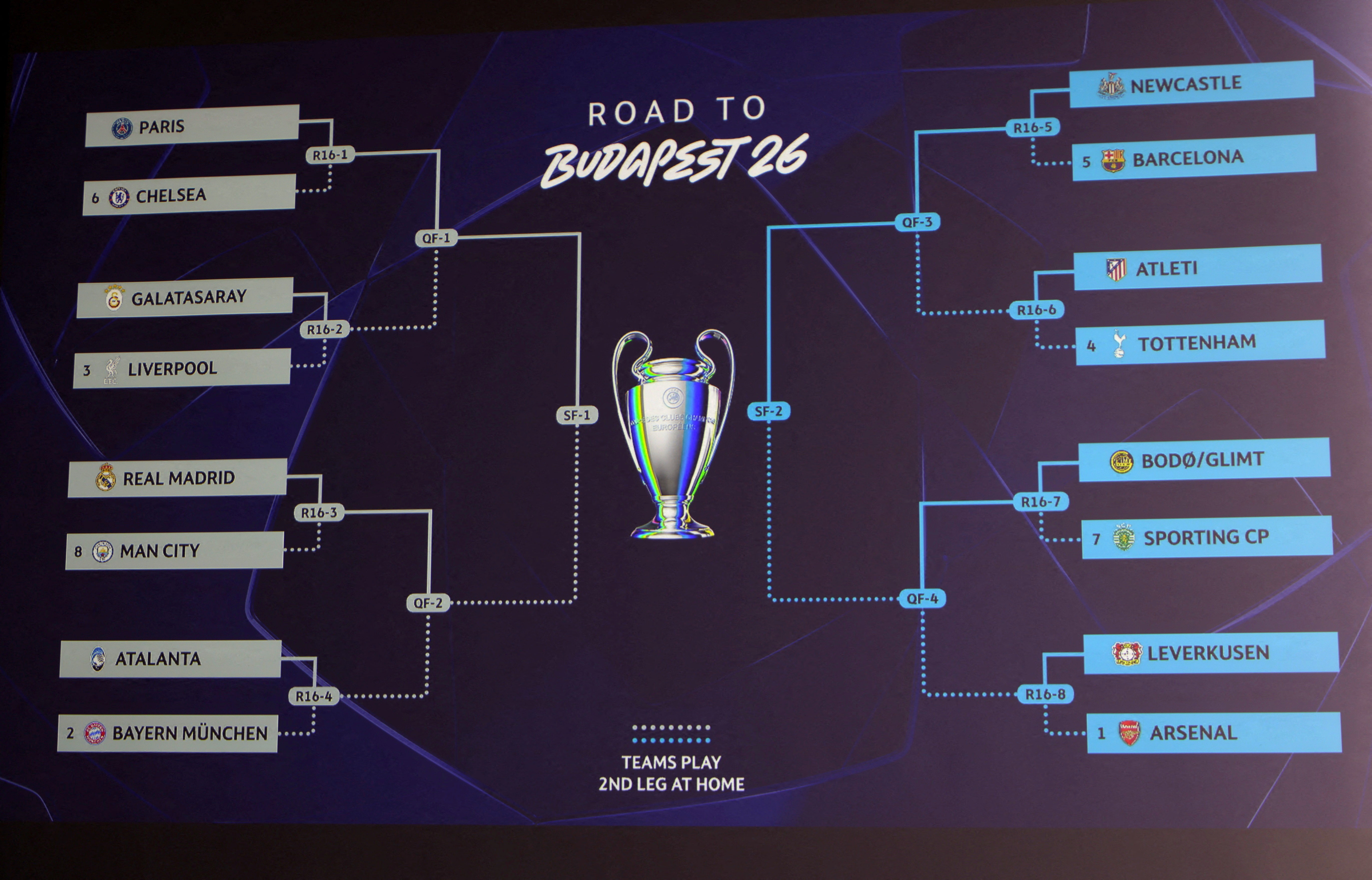 皇家馬德里在十六強遇上曼城,阿特蘭大的對手是拜仁慕尼黑,勝出的兩支球隊將於八強相遇。