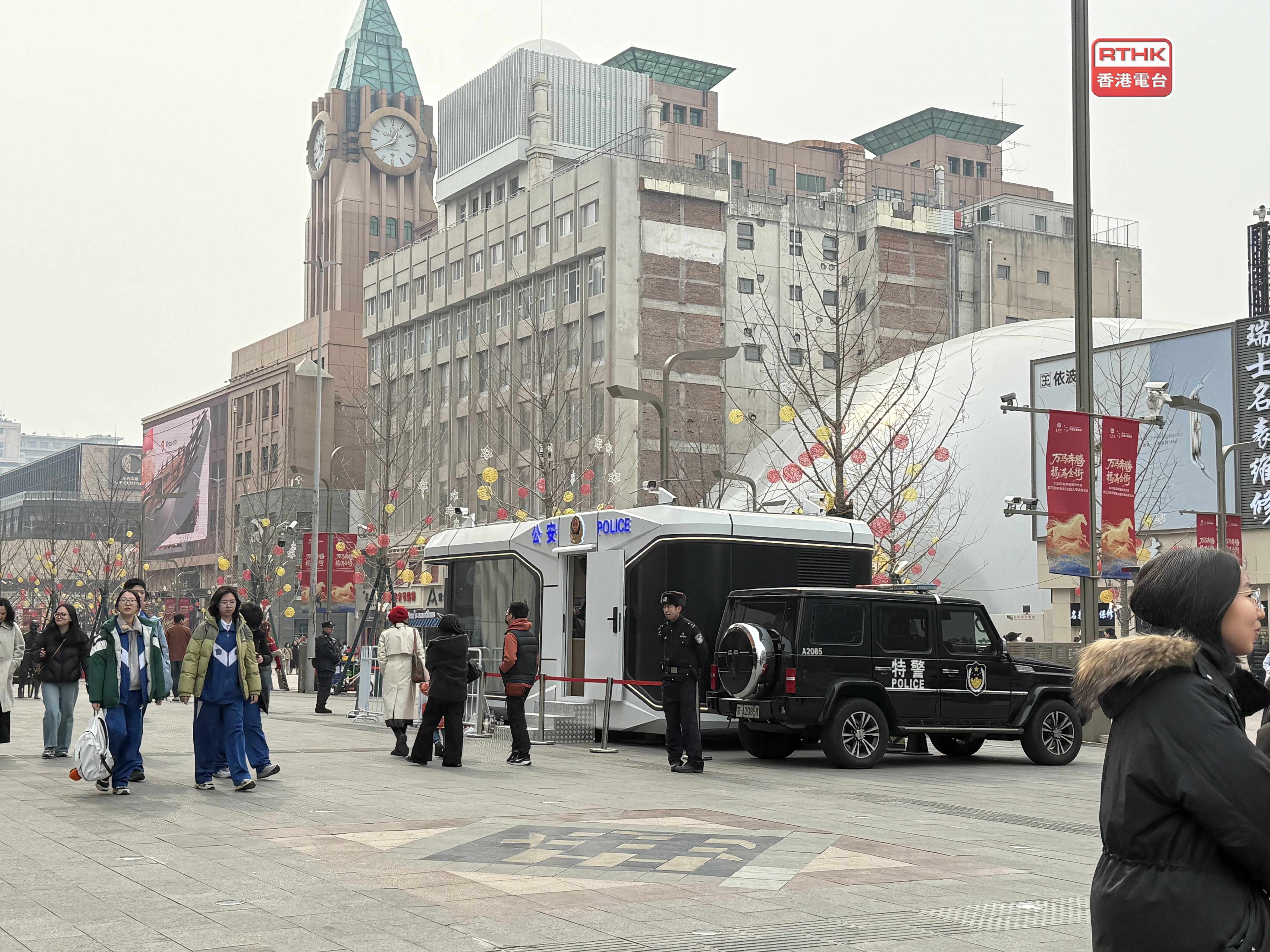 北京市面保安明顯加強,王府井大街一帶停泊多輛公安車,有安保人員手持盾牌巡邏和駐守站崗;長安大街設有多個帳篷查驗民眾和旅客的證件和隨身物品,也有武警巡邏。