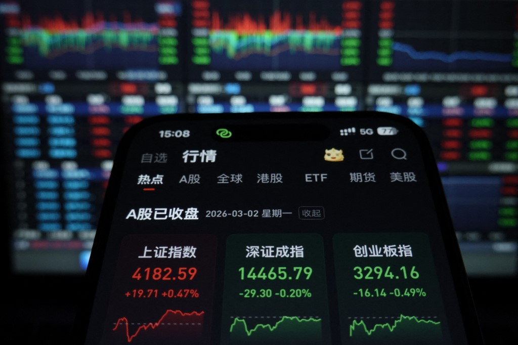 上證指數反覆,今早一度跌近0.8%,午後反彈,收報4182點,升幅約0.5%。(法新社)