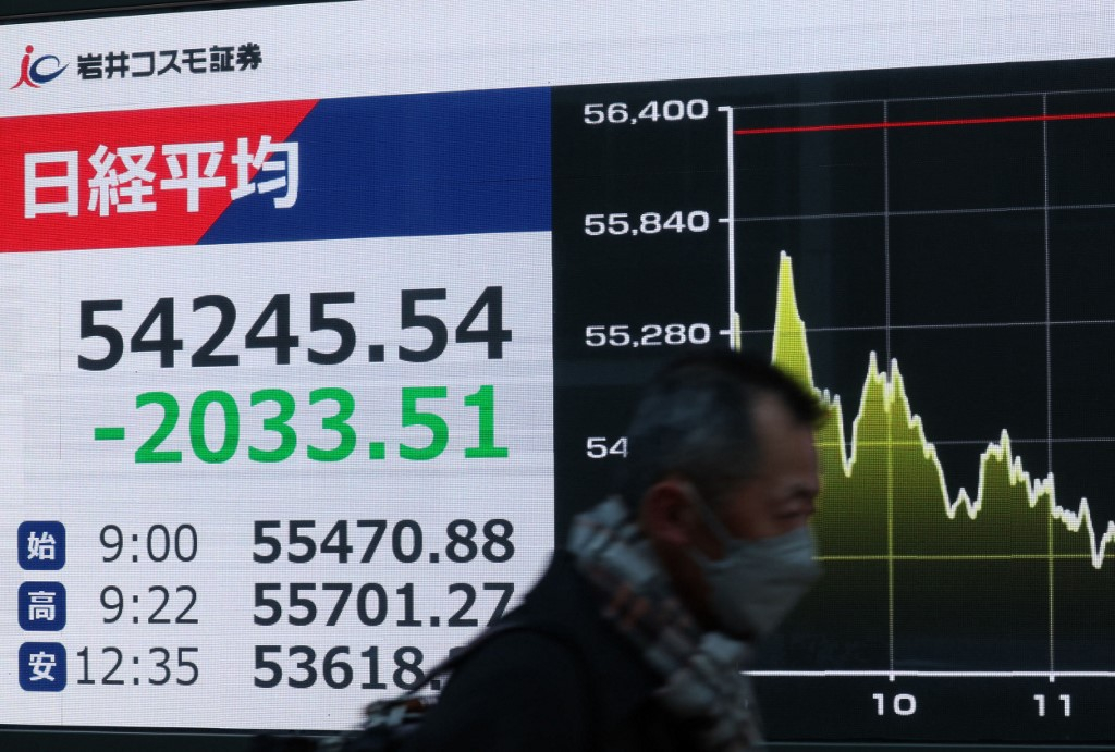 日經指數收報54245點,跌2033點,跌幅3.6%,創去年4月以來最大單日跌幅。(法新社)