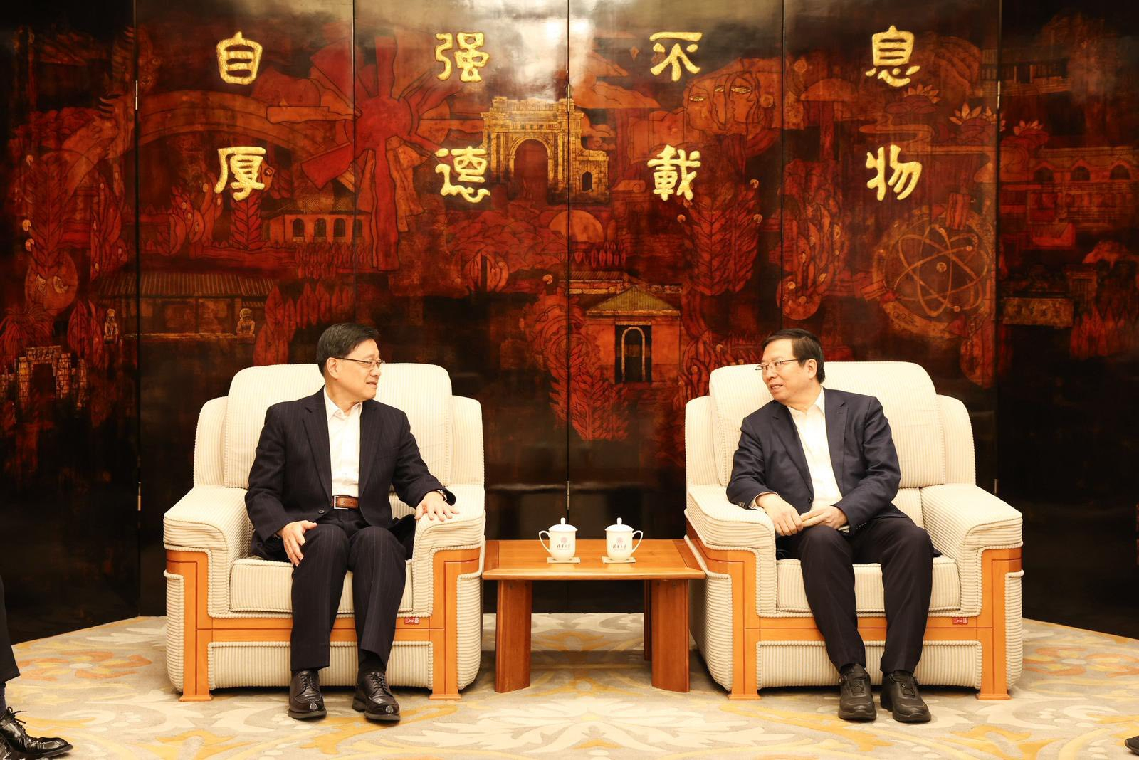 李家超(左)與清華大學黨委書記邱勇(右)會面。(李家超社交專頁)