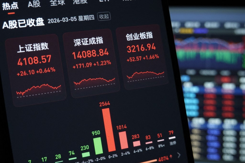 上證指數重返4100點,收報4108點,升26點,升幅0.64%。(法新社)