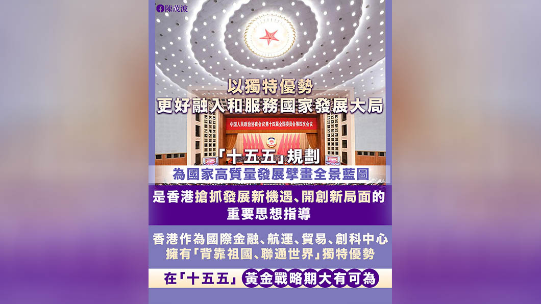 財政司司長陳茂波表示,「十五五」規劃為國家的高質量發展擘畫全景藍圖,不僅對中國式現代化強國建設、民族復興偉業具有非常重要的意義,也是香港搶抓發展新機遇、開創新局面的重要思想指導。