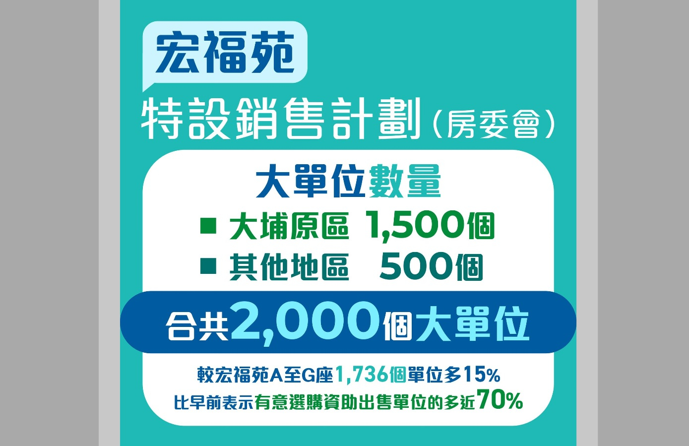 房屋局局長何永賢表示,就宏福苑長遠居住安排,為配合該屋苑原本約400多呎的單位面積,房委會在「特設銷售計劃」特別向出售業權的宏福苑業主,提供了2000個400多呎至500多呎的大單位,比早前在問卷調查中表示有意選購資助出售單位的業主多近70%。
