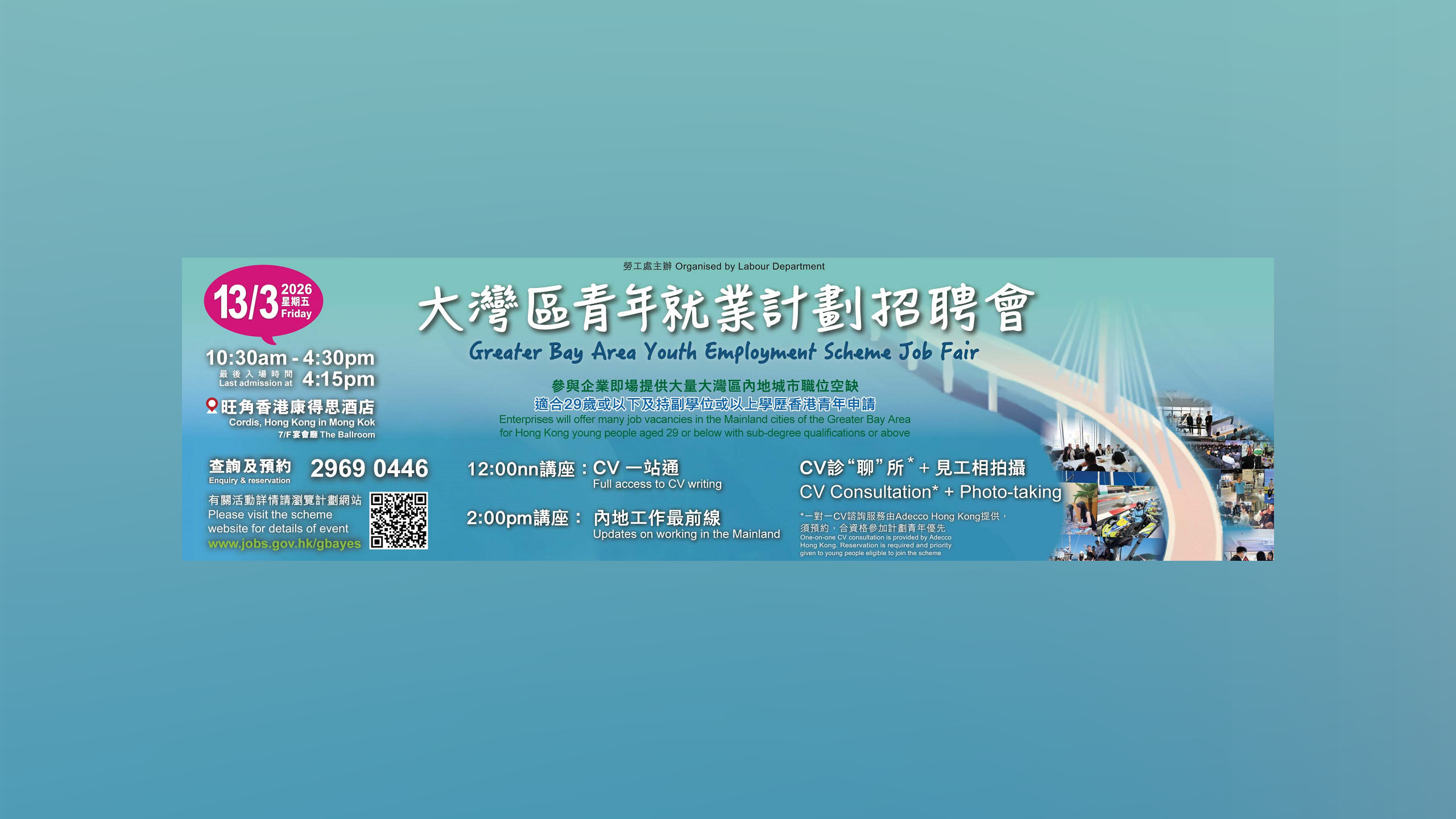 招聘會同時設有講座,講解撰寫求職履歷的技巧及如何善用社交媒體及人工智能工具作為輔助,以及在大灣區內地城市工作及生活的最新資訊。招聘會於當日上午10時半至下午4時半,在旺角康得思酒店7樓宴會廳舉行,免費入場。