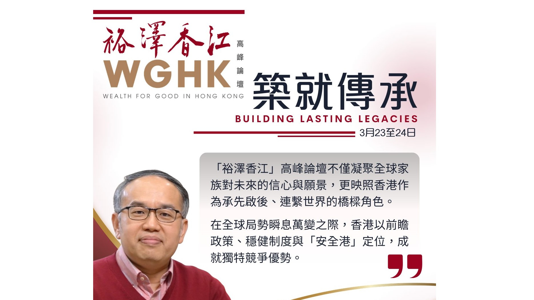 第四屆「裕澤香江」高峰論壇本月23至24日舉行,主題是「築就傳承」,彰顯家族辦公室資產規模持續增長與財富世代交替正在掀起的浪潮。財經事務及庫務局局長許正宇表示,本屆論壇將從三大方向,向全球家族創一代與新一代,展示香港深厚實力與發展潛能。