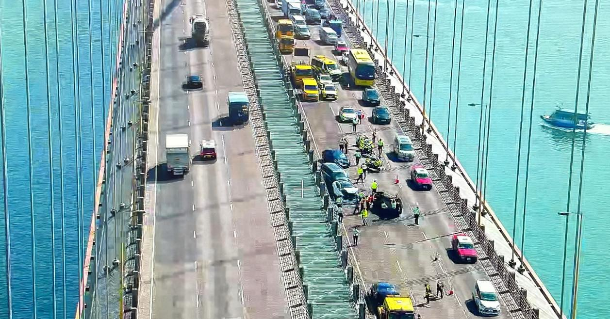 運輸署表示,因交通意外,青馬大橋往機場方向的部分行車線仍然封閉,現場交通擠塞。(運輸署社交網站圖片)