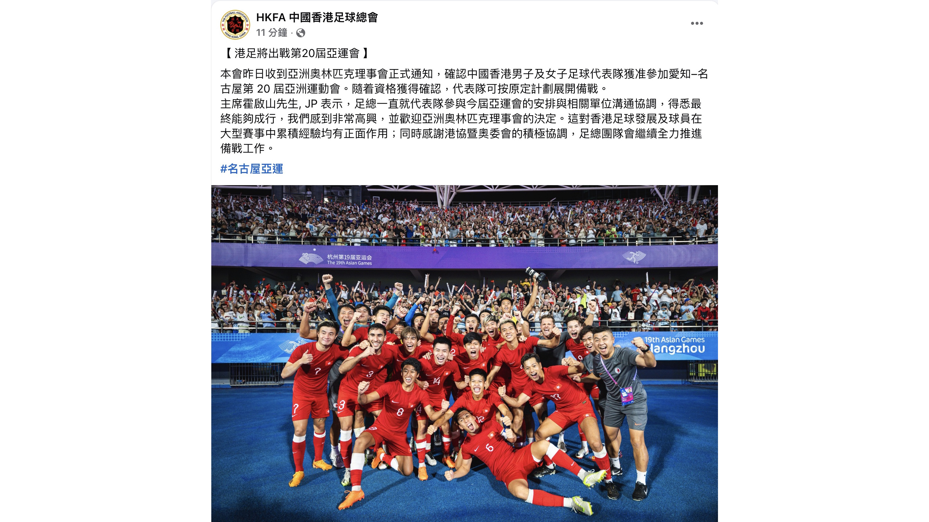 足總表示,港隊男足及女足將出戰亞運會。(足總社交網站)