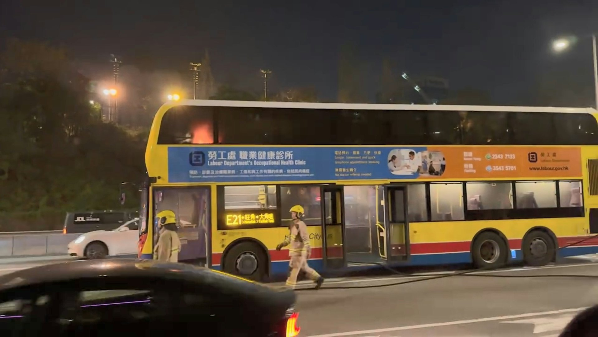 城巴表示,初步調查發現,起火的是一輛E21號線往大角咀(維港灣)方向的巴士,懷疑事發時上層前排座位一名乘客的充電器冒煙,隨後起火。