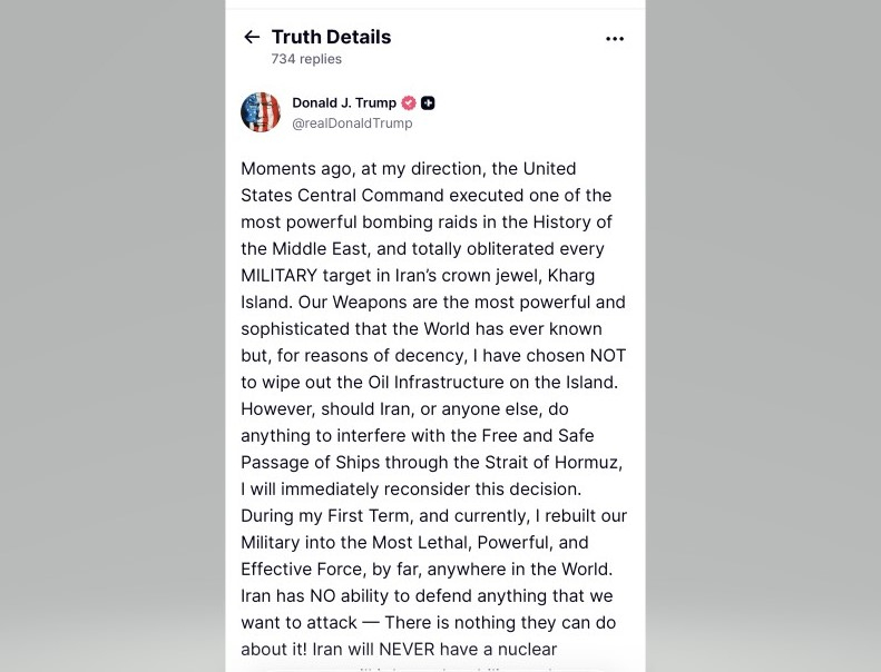 特朗普在帖文表示,出於道義,他選擇不摧毀島上的石油基礎設施,但是如果伊朗或任何其他國家採取任何行動,干擾船隻自由安全通過霍爾木茲海峽,他將立即重新考慮這個決定。