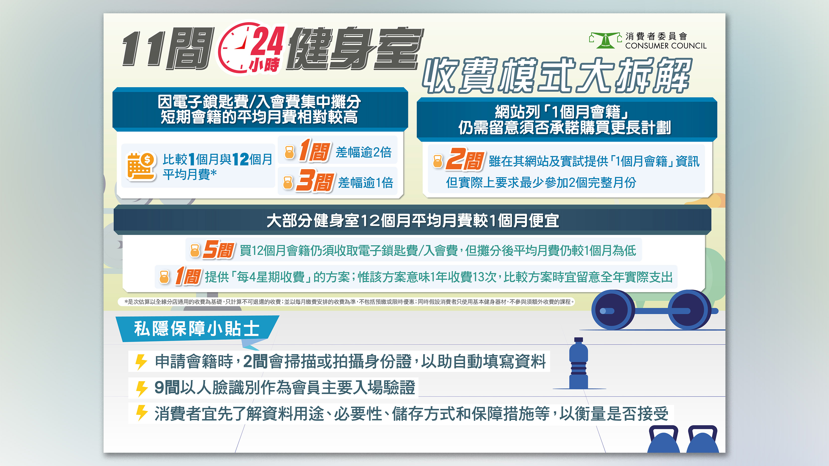 消委會整合11間24小時健身室的服務收費及條款資料,發現雖然各健身室均設有按月的收費模式,但當中5間在基本月費之外,亦須另收入會費、電子鎖匙或匙卡費等,攤分相關成本後會推高平均月費。消委會比較1個月與12個月會籍的平均月費,有1間健身室除基本月費外,亦收取電子鎖匙費和入會費,折算後,1個月平均月費與12個月的差幅逾2倍;另有3間折算後的1個月與12個月平均月費差距亦超過1倍。