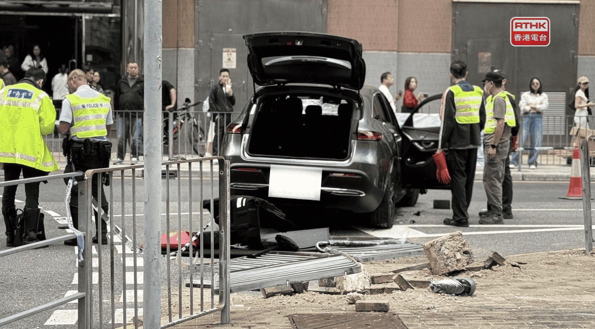 消防人員在現場一度打開車頭蓋檢查肇事私家車,可見車頭左邊座位玻璃窗破裂,車門輕微凹陷,附近行人路有欄桿被撞爛。