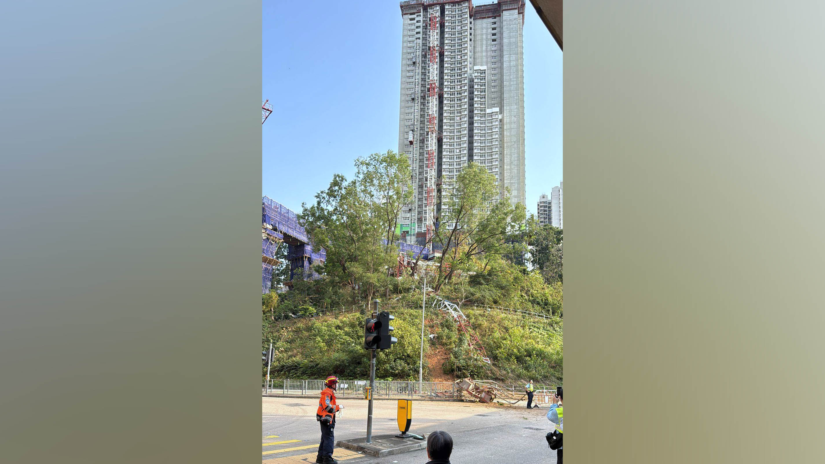 網上圖片所見,一個天秤倒冧壓在地盤及山坡,消防員到場架起雲梯視察情況。