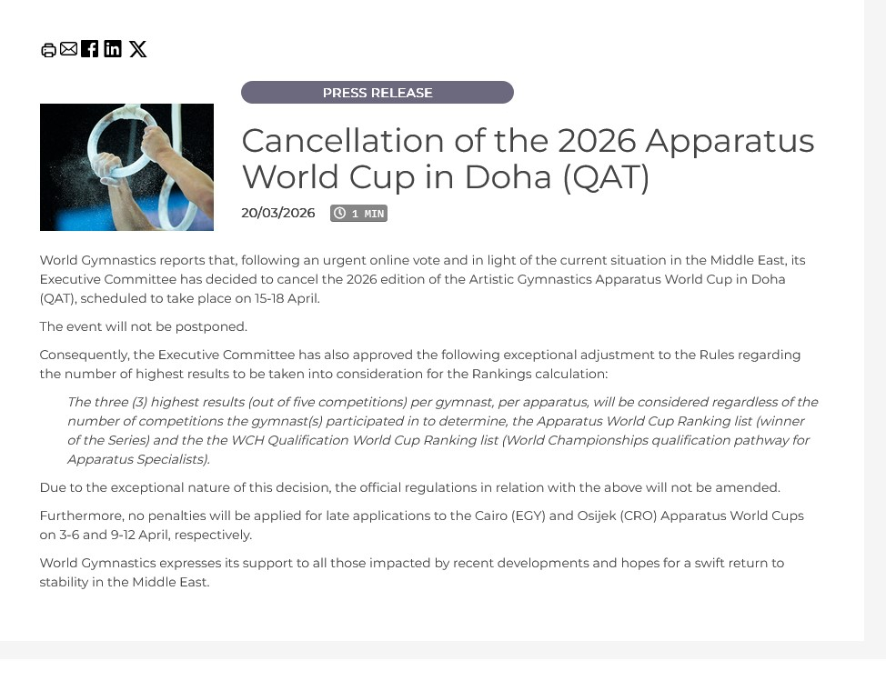 世界體操聯合會公布,由於目前中東地區局勢,經緊急網上投票,執委會決定取消原定於下月舉行的2026年體操單項世界盃多哈站比賽。
