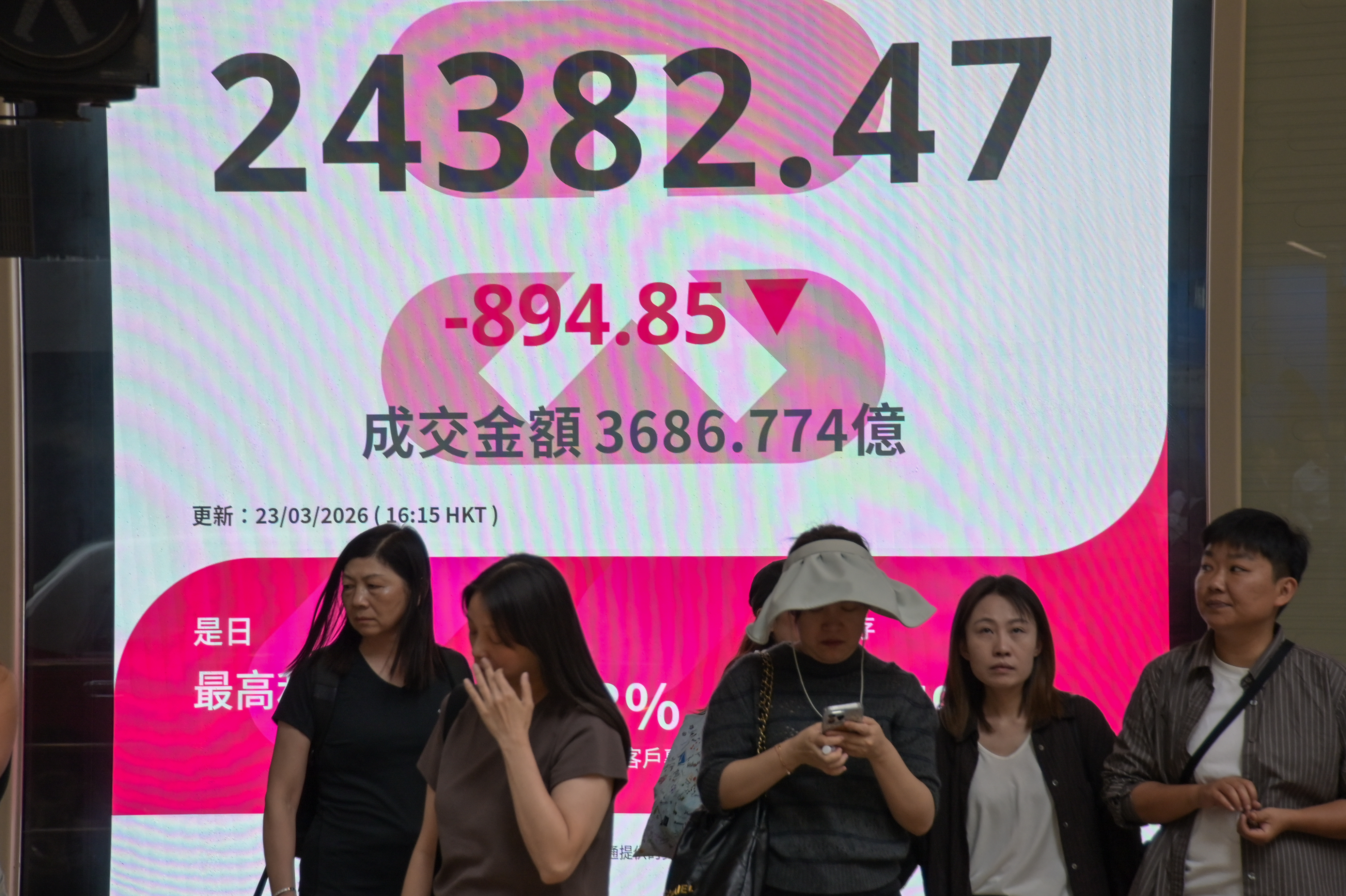 中東局勢持續緊張,亞太區內股市顯著下挫,港股一度急跌逾1000點,創近一年最大跌幅。恒生指數收市跌894點,報24382點。內地3大指數跌3%以上。日韓台股市下挫超過2%至6%。