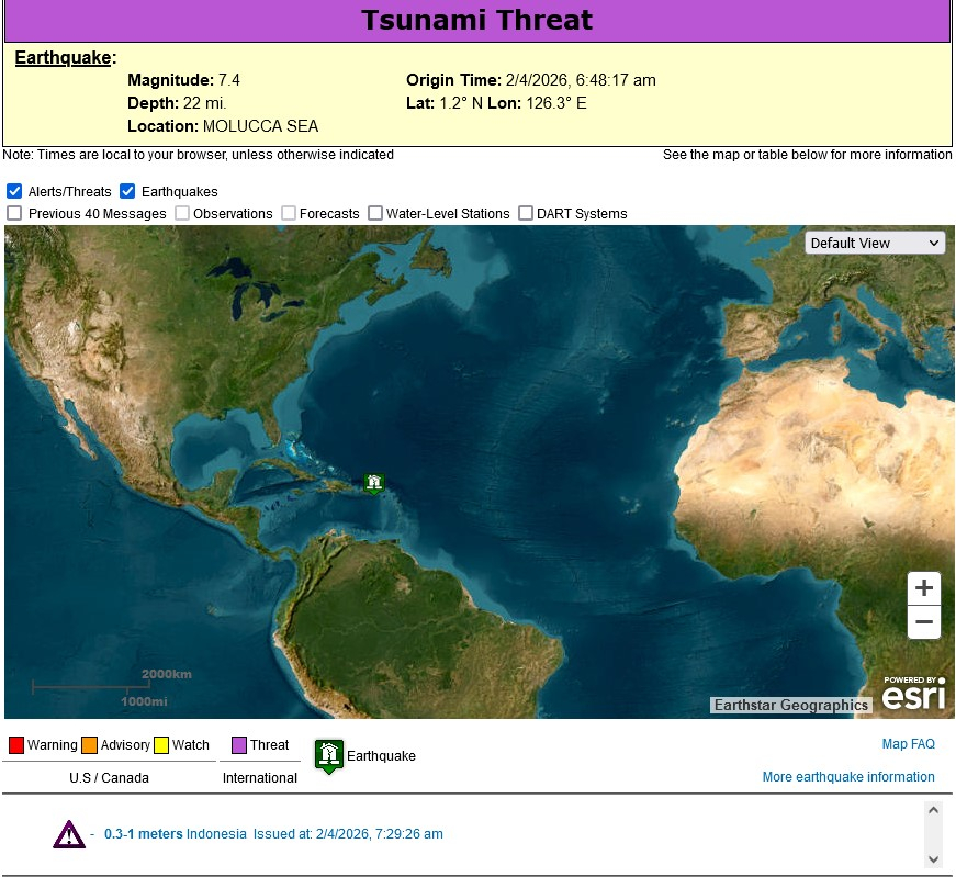 美國海嘯預警中心表示,印尼部分沿海地區可能出現0.3至1米的海嘯。(網絡截圖)