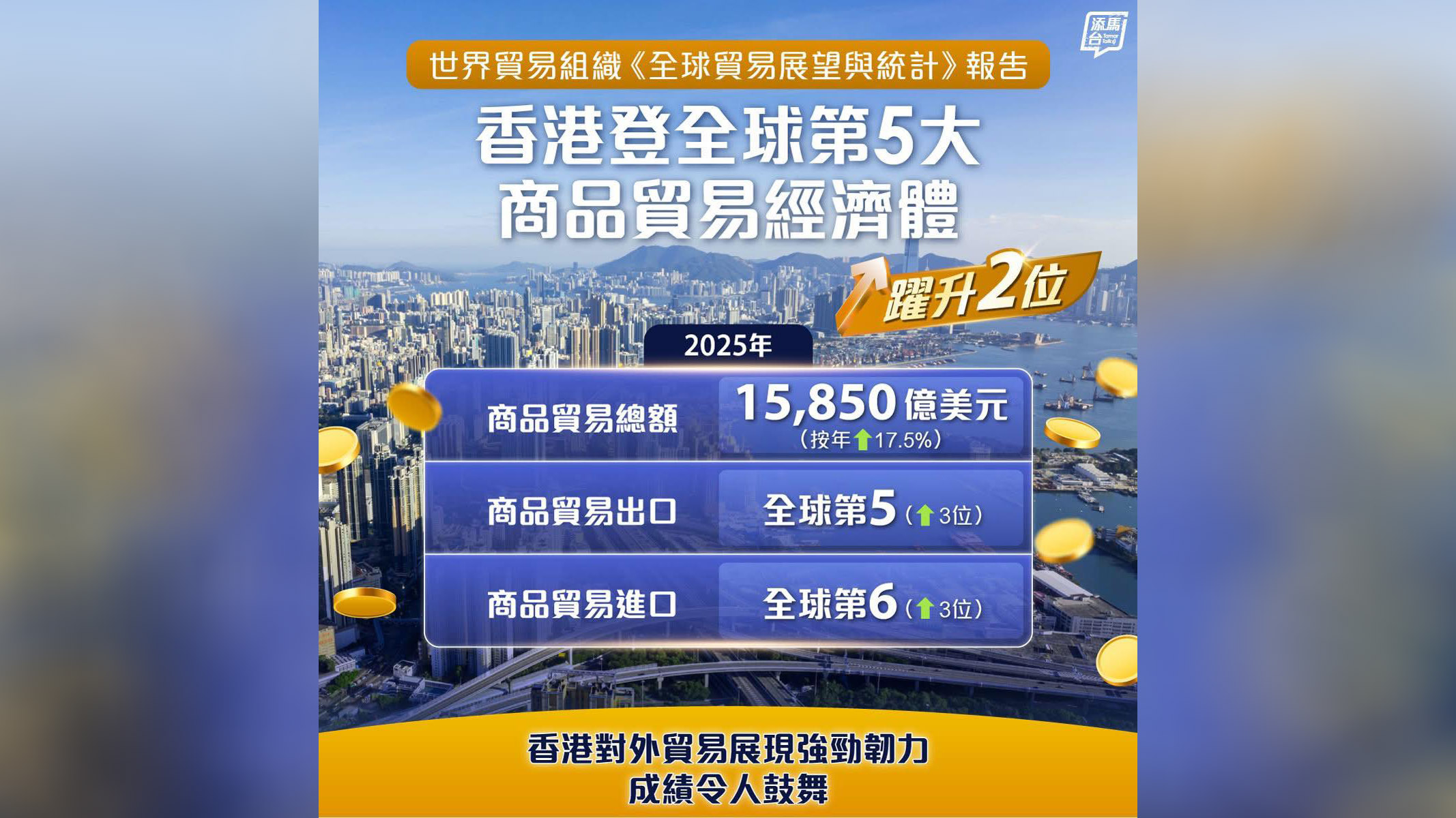 財政司副司長黃偉綸表示,根據世界貿易組織最新發表的《全球貿易展望與統計》報告,去年香港緊隨中國內地、美國、德國與荷蘭,位列全球第五大商品貿易經濟體。商品貿易總額達15850億美元,按年上升17.5%,佔全球總額 3%,成績令人振奮。