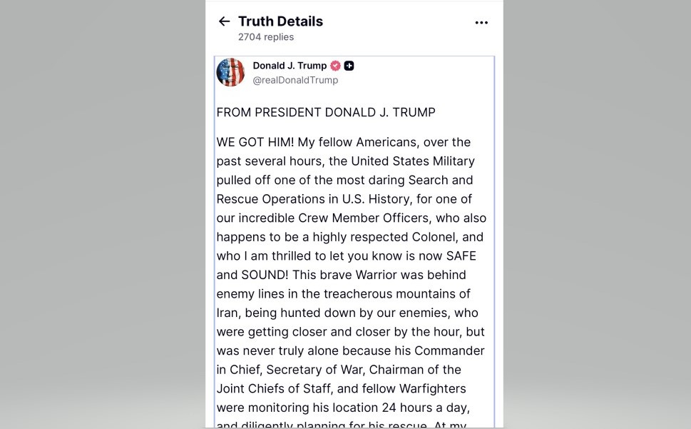 特朗普在社交平台發文說,美國軍方完成美國歷史上最大膽的搜救行動之一,派出飛機攜帶武器,營救在伊朗失蹤的第二名美軍機師,他受了傷,但會康復。