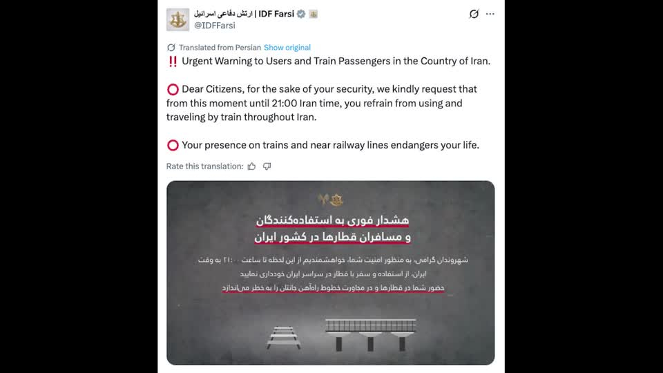以色列國防軍在社交平台用波斯語發表聲明,警告伊朗民眾不要乘坐火車或靠近鐵路。