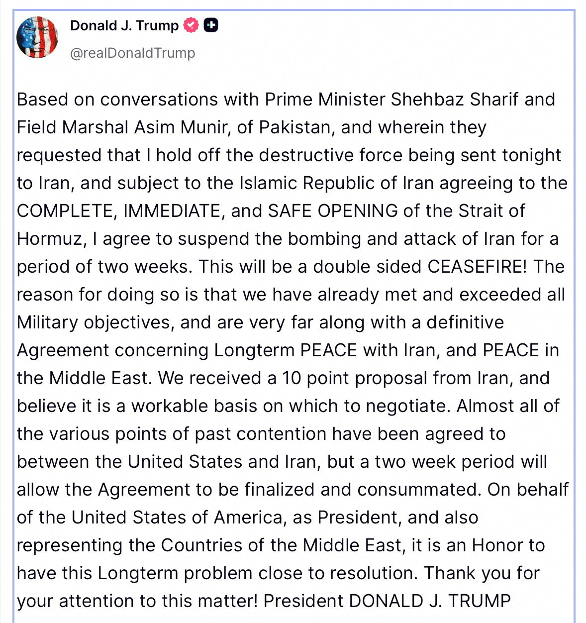美國總統特朗普在要求伊朗重開霍爾木茲海峽的限期屆滿前,同意應巴基斯坦總理夏巴茲要求,暫停對伊朗的軍事行動,為期兩星期,前提是伊朗同意全面開放霍爾木茲海峽。