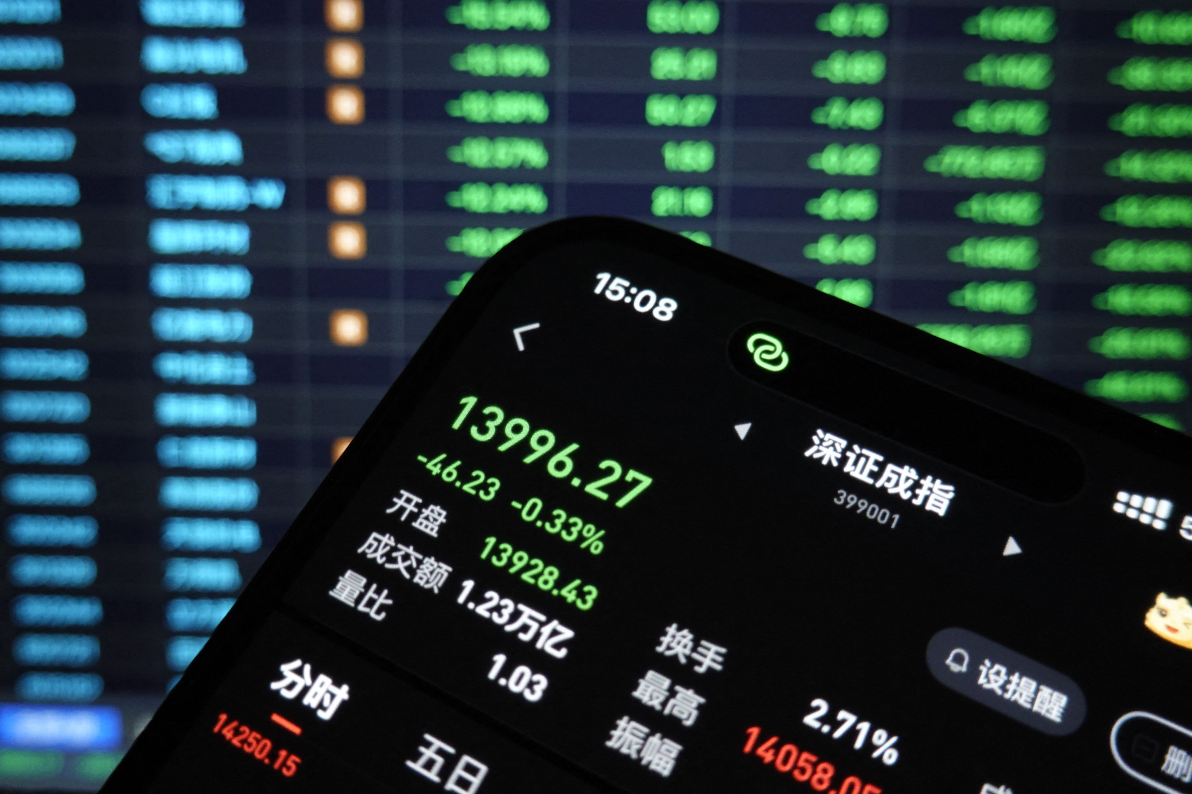 內地股市回吐,深證成份指數跌穿14000點關口,收報13996點,跌幅0.33%。(法新社)