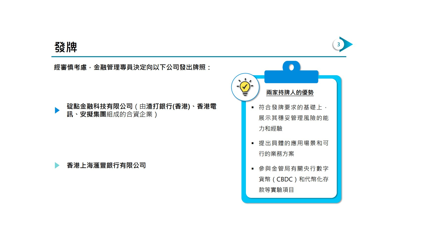當局一共收到36家機構提出申請,過去半年監管團隊全面及深入審視每份申請,強調發牌有相當高門檻,審批時考慮申請人是否具備充分風險管理能力及經驗,並遵守香港及其他地區相關法規,以及能否提出具體應用場景及可行方案。