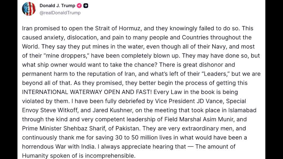 特朗普在社交平台的帖文中又說,美方會開始摧毀伊朗在霍爾木茲海峽佈設的水雷,如果伊朗方面向美方或和平船隻開火,都會被炸進地獄。