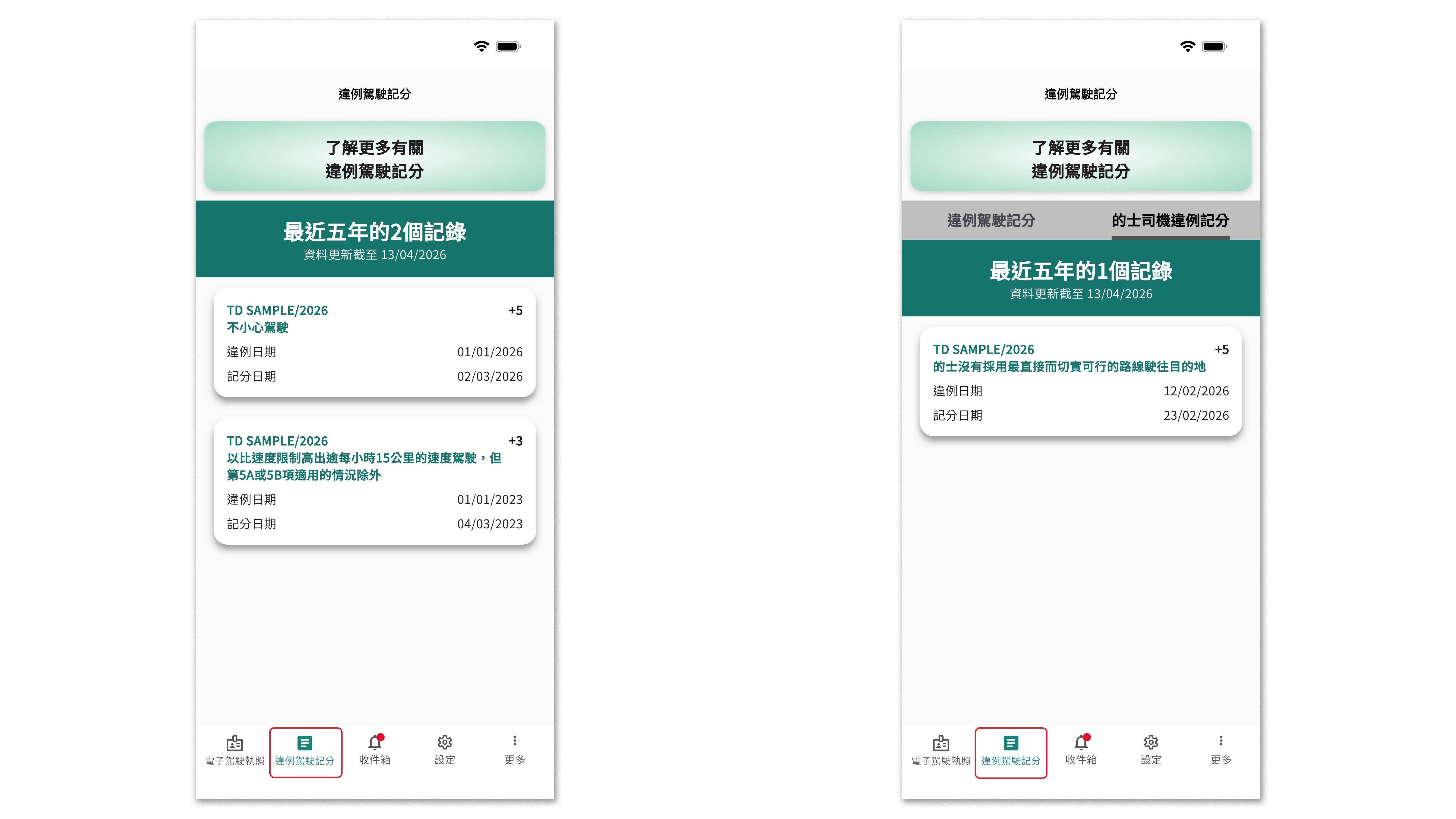 署方在社交網頁說,駕照持有人現在可點擊手機程式底部新增的「違例駕駛記分」功能,隨時查閱5年內的違例駕駛記分紀錄,包括的士司機的違例記分紀錄。