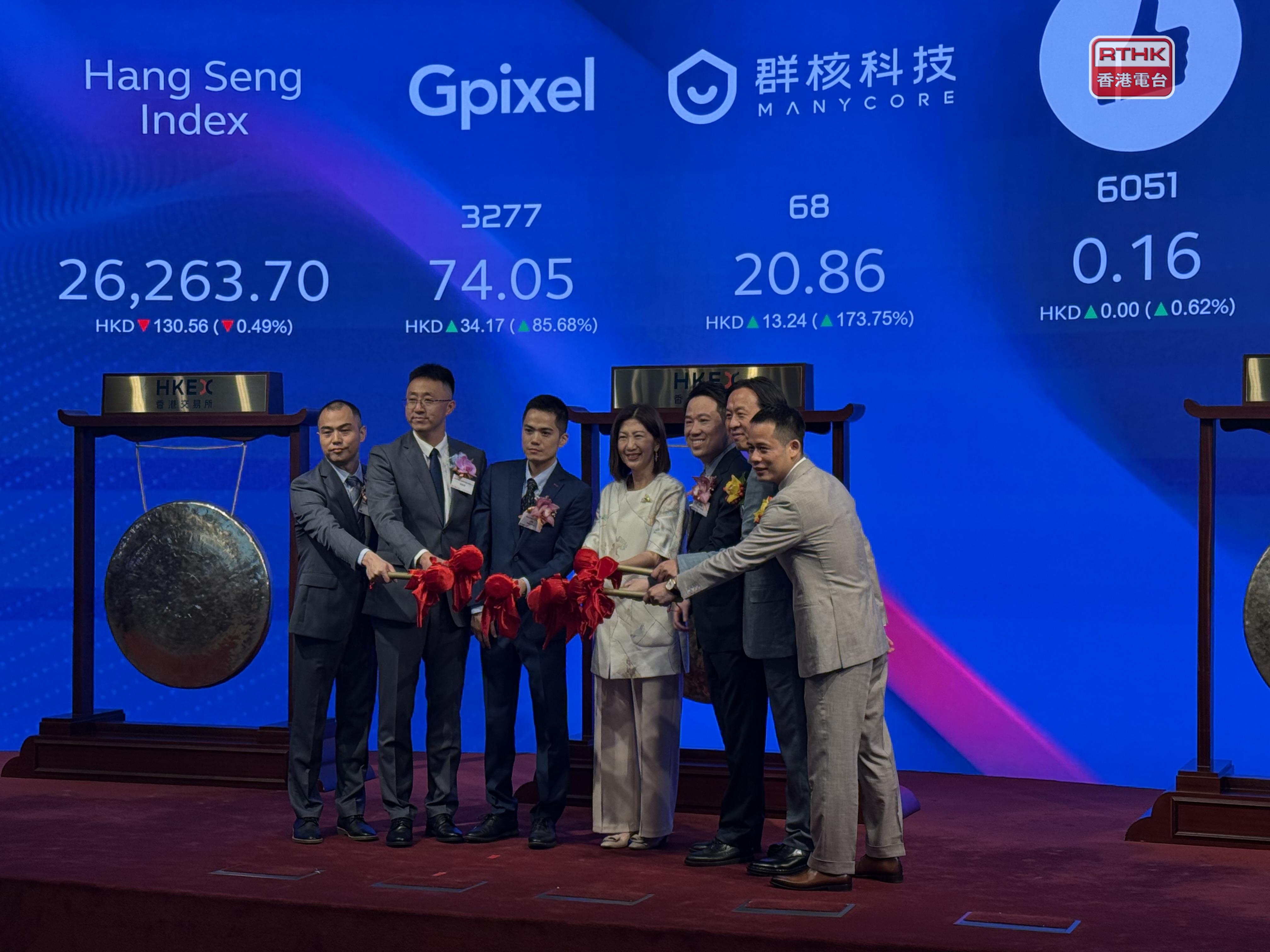 兩隻新股首日掛牌,其中「杭州六小龍」之一的群核科技,股價高見21.86元,較招股價高近1.9倍,較早時升幅逾1.2倍。至於內地圖像傳感器供應商長光辰芯,股價高見85元,較招股價高1.1倍,較早時升幅逾83%。