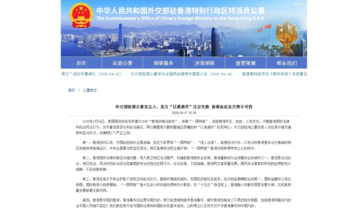 外交部駐港公署發言人對美國國務院發佈所謂2026年「香港政策法報告」,抹黑「一國兩制」,詆毀香港民主、自由、人權狀況,污蔑香港國安法律和執法司法行為,充斥著謊言謬論和政治偏見,再次暴露美方霸權霸道醜惡嘴臉和「以港遏華」險惡用心,表示強烈譴責和堅決反對。