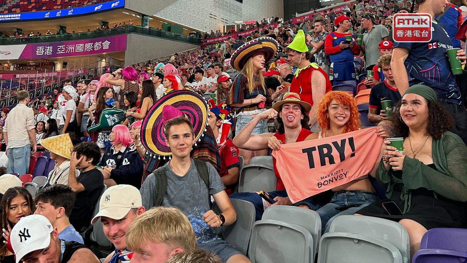 一連3日的香港國際七人欖球賽今日開鑼,今年是這項盛事50周年。賽事第二年在啟德體育園主場館舉行,氣氛最熱烈的南看台,不少觀眾悉心打扮,穿上奇裝異服。有居港的外籍人士表示,氣氛很好。
