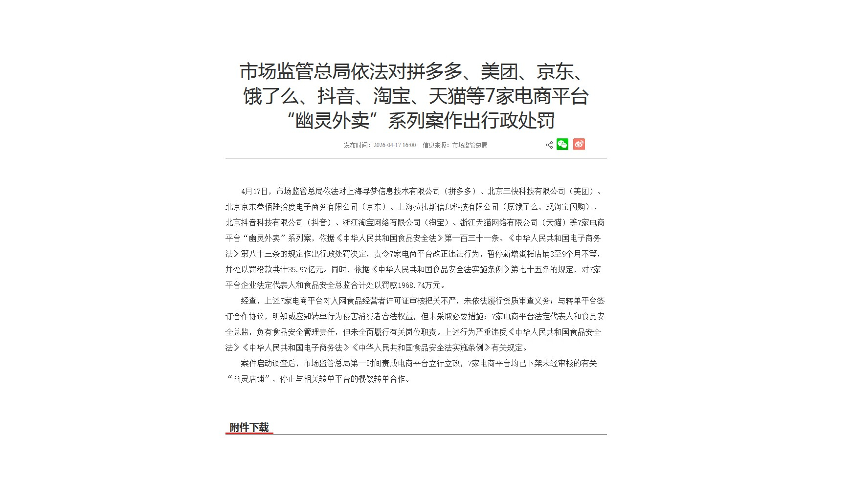 有關電商平台包括拼多多、美團、京東、抖音、前稱餓了麼的淘寶閃購、淘寶、天貓。當局責令平台改正違法行為,暫停新增蛋糕店舖3至9個月。當局又對7家平台的企業法定人及食品安全總監,合共罰款約1969萬元。