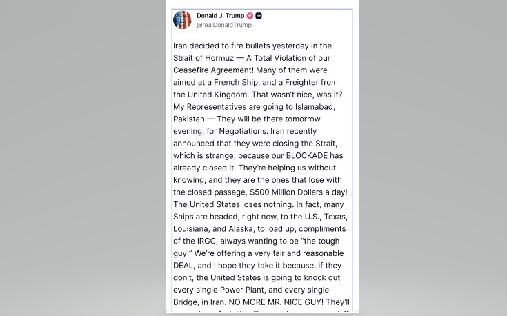 特朗普在社交平台發文透露,他的代表正前往巴基斯坦首都伊斯蘭堡,準備和伊朗談判,預計將在當地星期一晚抵逹。他表示,美方提供的條件非常公平合理,期望伊朗能夠接受,否則美國將摧毀伊朗每一座發電廠和每一座橋樑。
